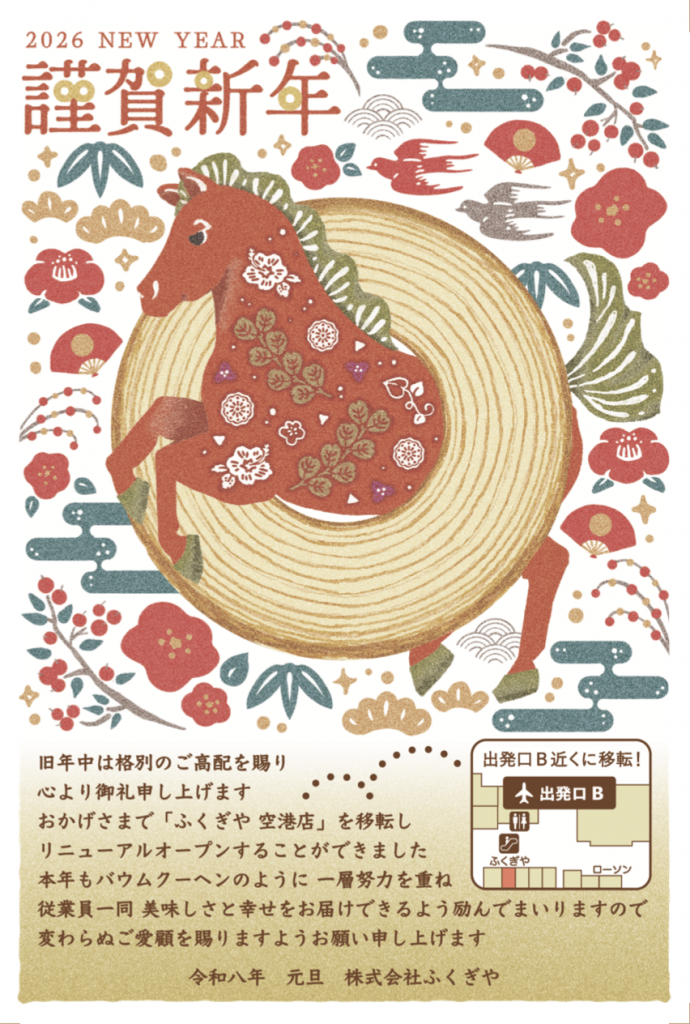 HOME > お知らせ > 新年のご挨拶 2026.1.1 新年のご挨拶 新年明けましておめでとうございます 旧年中は格別のご高配を賜り 心より御礼申し上げます おかげさまで「ふくぎや 空港店」を移転し リニューアルオープンすることができました 本年もバウムクーヘンのように 一層努力を重ね 従業員一同 美味しさと幸せをお届けできるよう励んでまいりますので 変わらぬご愛顧を賜りますようお願い申し上げます 一覧 次を見る »